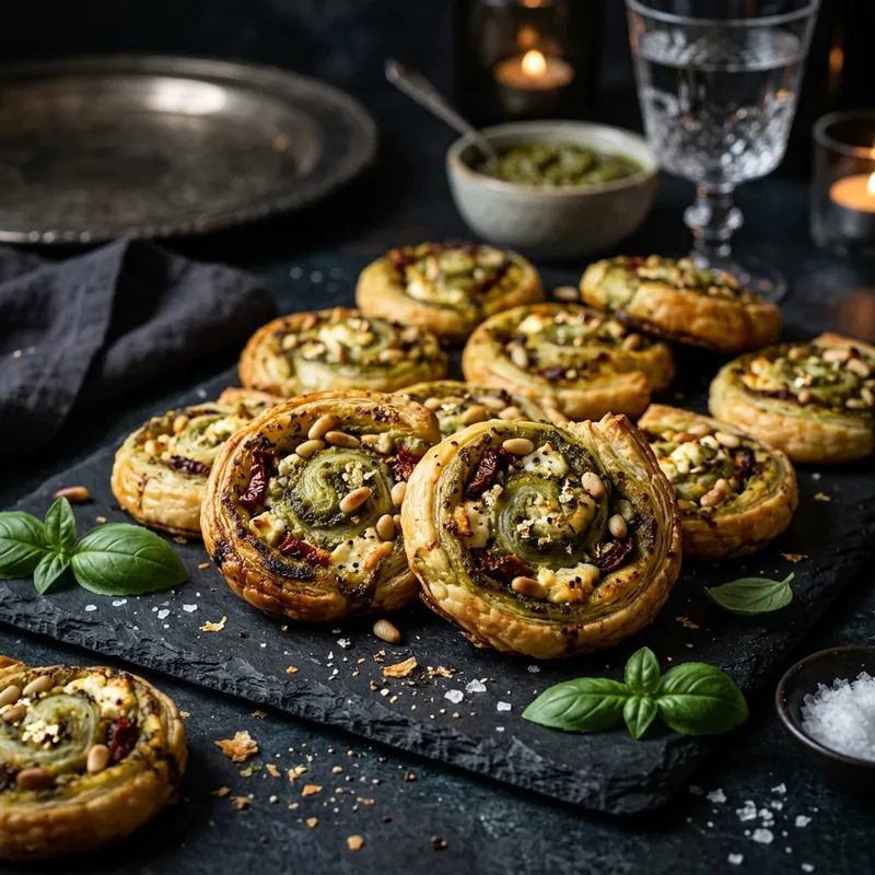 Die abgekühlten Blätterteig-Spiral-Spieße vom Holz nehmen. Nun abwechselnd Kirschtomaten, Mini-Mozzarella und frische Basilikumblätter auf die Blätterteig-Spiralen stecken. Mit Pesto beträufeln und servieren.