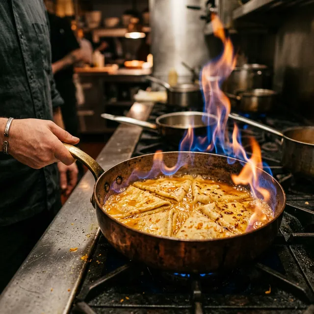 Nerd-Fact: Beim Flambieren von Grand Marnier (Orangenlikör) verbrennt fast ausschließlich der pure zugefügte Alkoholanteil. Zurück und in die Poren der Crêpes gebacken wird nur das konzentrierte Bitterorangen-Destillat.