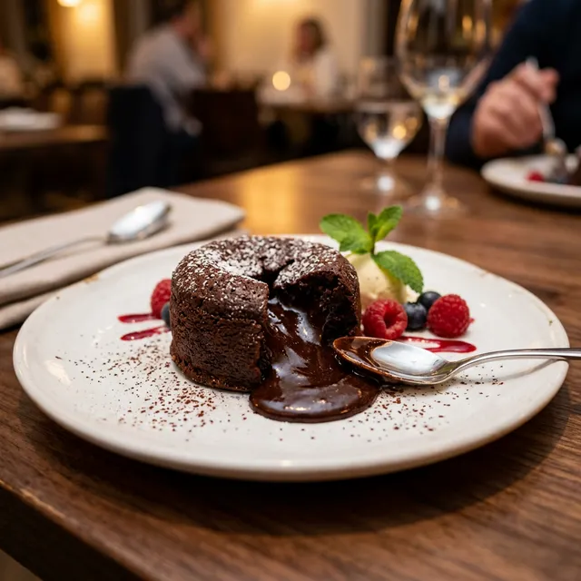 Nerd-Fact: Der physikalische Effekt des Lava-Kuchens (Mi-Cuit) beruht lediglich darauf, dass die hochgradig fettig und extrem warme Masse an Schokolade und Eigelb durch stark einwirkende Hitze an den Außenkappen und Rändern starr und verkrustet ausbäckt, indes der innerste Kern auf knapp 55°C stehen bleibt.