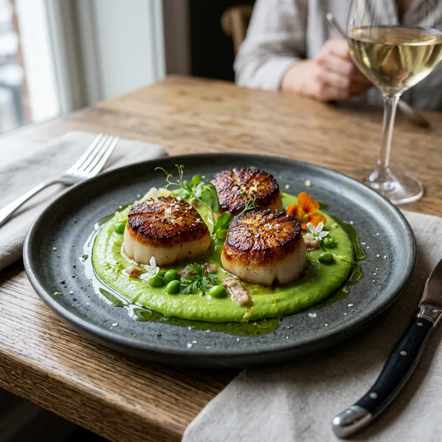 Nerd-Fact: Jakobsmuscheln sind extrem teuer und in der konventionellen Pfanne in Sekunden gummiartig (overcooked). Bei exakt 50°C wird das feine Muskelfleisch formstabil, aber bleibt zart wie Seide.