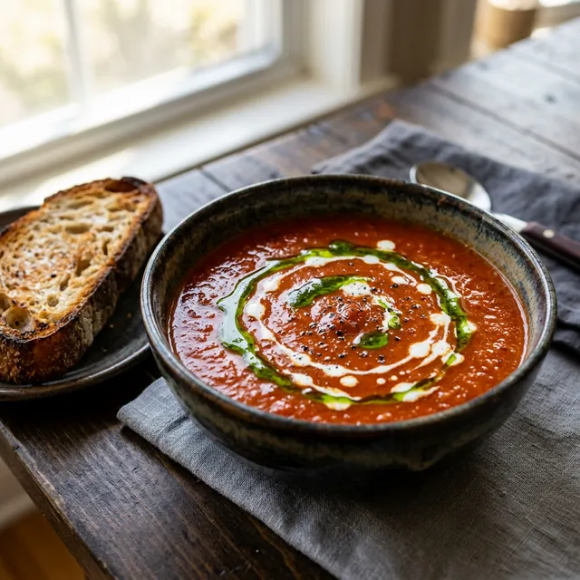 Nerd-Fact: Das Rösten von Tomaten bricht Zellwände auf und sorgt durch leichte Maillard-Reaktionen für ein tieferes Aromaprofil.