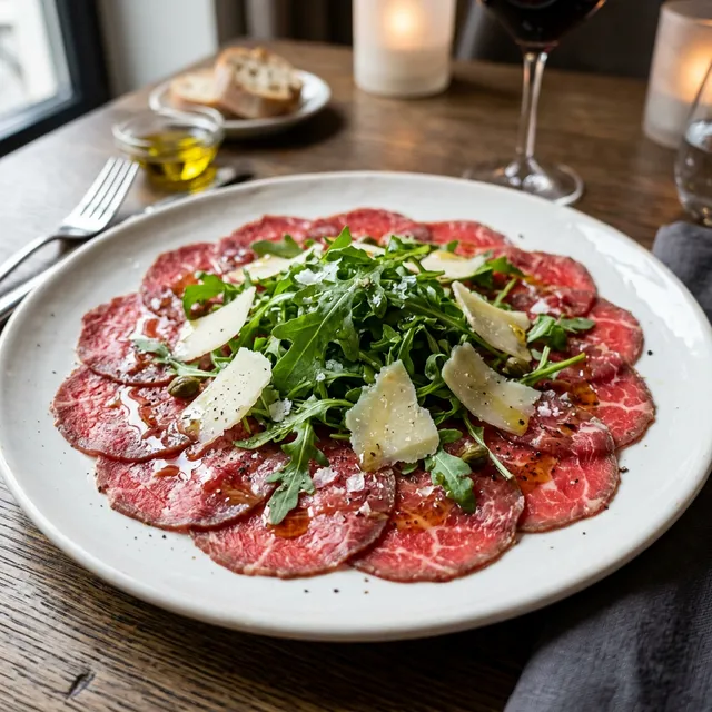 💡 Detis Tipp: Lass den Rucola nicht schon stundenlang auf dem Carpaccio liegen. Die Säure des Dressings lässt ihn matschig werden.
