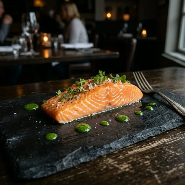 Nerd-Fact: Durch das sanfte Garen bei exakt 43°C im Vakuum denaturiert das Fischeiweiß minimal, während die Struktur komplett erhalten bleibt. Das Ergebnis ist eine mi-cuit (halbgegarte) Textur, die auf der Zunge schmilzt.