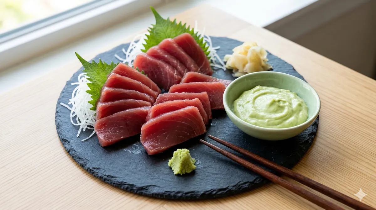 Fischscheiben fächerartig auf einem flachen Steinteller anrichten. Einen großzügigen Strich der Wasabi-Mayo danebenziehen.