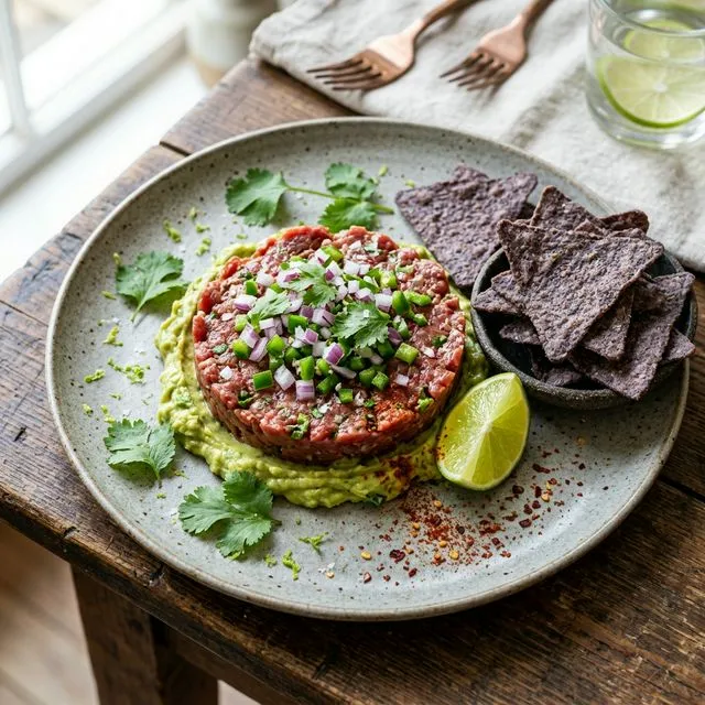 Das Tartar direkt auf dem weichen Avocado-Bett anrichten. Mit blauen Tortillachips servieren.