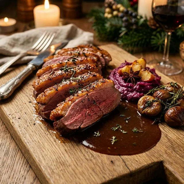 Nerd-Fact: Eine ganze Gans wird im Ofen oft ungleichmäßig (trockene Brust, rohe Keulen). Durch das Sous-Vide Garen bei 65°C erreichen wir eine extrem saftige, durchgehend zart-rosa Brust. Das harte Kollagen zersetzt sich sanft.