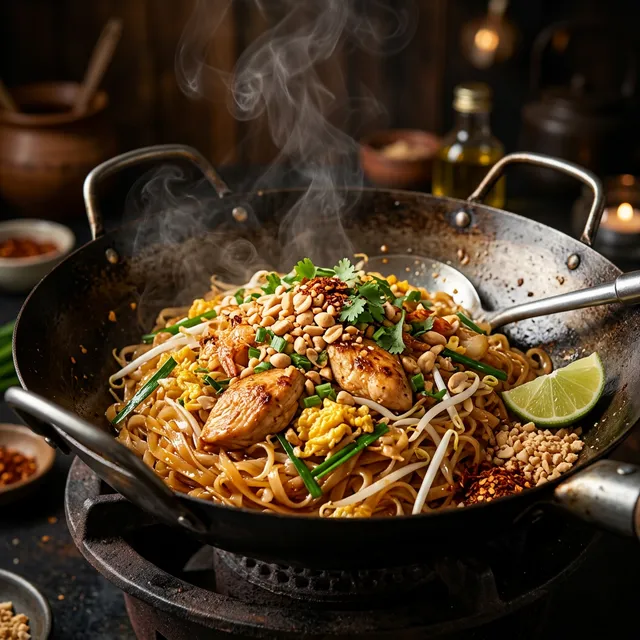 Protein (Huhn/Tofu) im Wok anbraten. Die gut abgetropften (aber nicht matschigen) Reisbandnudeln zugeben.