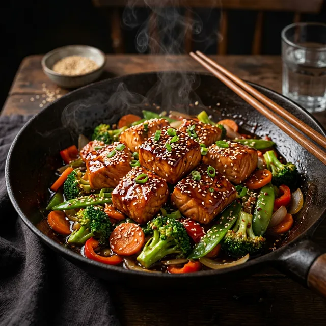 Auf einem Bett vom Wok-Gemüse anrichten, mit reichlich Sesam bestreuen.