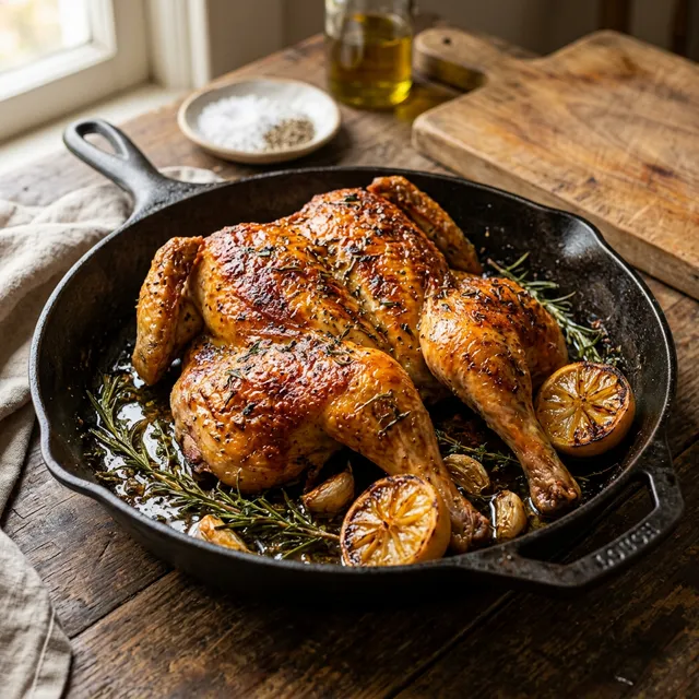 - ▪Krosse Haut als Finish: Erhöhe die Temperatur erst in den letzten 20-30 Minuten auf 220°C+, oder schalte den Grill zu, um die inzwischen papierdünne Haut extrem knusprig aufpoppen zu lassen.