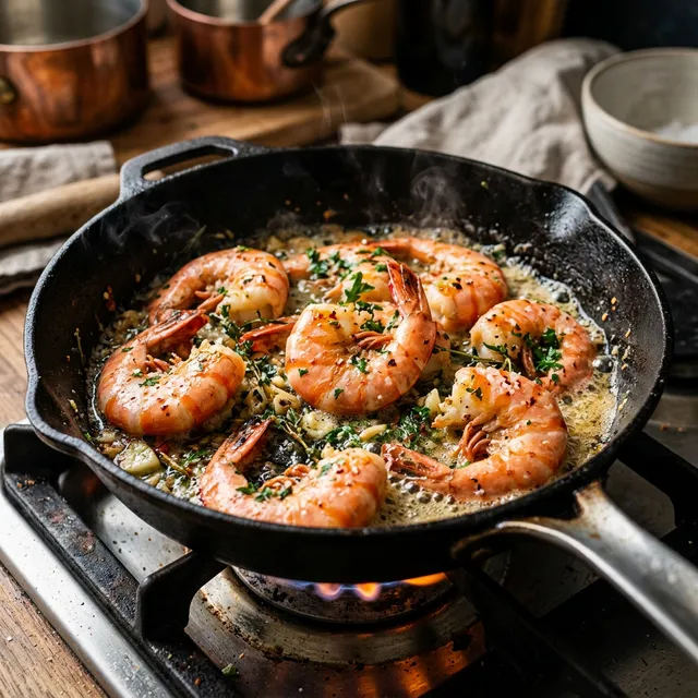 - ▪Brate Garnelen idealerweise mit Schale (Kopf/Panzer). Der Panzer schützt das Fleisch vor dem Austrocknen und gibt unglaubliches Aroma (die 'Krustentier-Butter') an das Fett ab.
